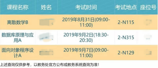 通过上述“方式一”或者“方式二”即可查询到学生本人的补考安排,查询后示例图如下: