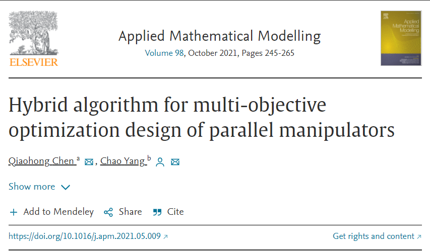 陈巧红老师结合拉丁超立方体、高斯回归模型与智能优化算法提出了一种并联机构多目标优化设计的混合算法,该算法在保证设计精度的同时可大幅降低优化设计的计算成本。研究成果发表在SCI一区TOP期刊《Applied Mathematical Modelling》。