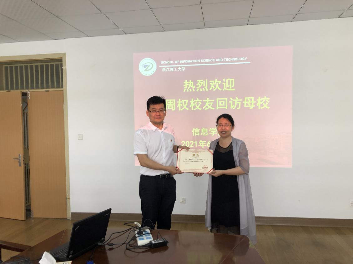 党课开始前,学院党委书记黄黎、党委副书记包新春在10-315会议室与丁周权校友一起座谈,并聘请校友为球王会校友导师。