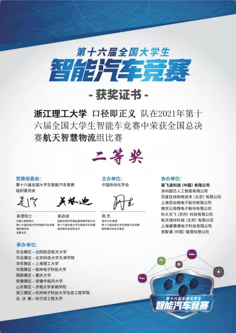 此次获奖团队“口径即正义”的参赛队员包括杨宗信、张子涵、于忠扬、陈杰、张子丹等几位同学。此外,在之前进行的全国智能汽车竞赛浙江赛区选拔赛中,由郑俊褒、杨旭、吴龙老师指导的“HERMES”队(林宏章、刘昊、黄嘉俊)、“局外人”队(陆士其、李泉龙、石佳)、“LDST”队(沈吟晓、石阳卿、汪昊南)获得浙江省赛区三等奖,“爱国者”队(王俊康、吴家声)获得浙江省赛区成功参赛奖。