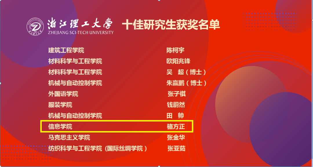 2019级电通专业硕士研究生骆方正获得了“十佳研究生”称号。他连续三年获得一等奖学业学金,省职业生涯规划大赛一等奖,被评为“三好研究生”和“优秀研究生干部”。在校期间参与省重点研发项目一项,并在核心期刊《电子测量技术》上发表论文一篇。他利用2年多的课余时间创作延时视频《光影浙理》在学校官方视频号发布,获6000次转发,1.3万次点赞;在“学习强国”刊登校园照片,获得超300万次浏览量和8万次点赞。他的思政微课《从“高水平全面小康”看浙江精神》在2020年度浙江省高校思政微课大赛中荣获三等奖,被选拔为浙江省党的十九届六中全会精神宣讲员。