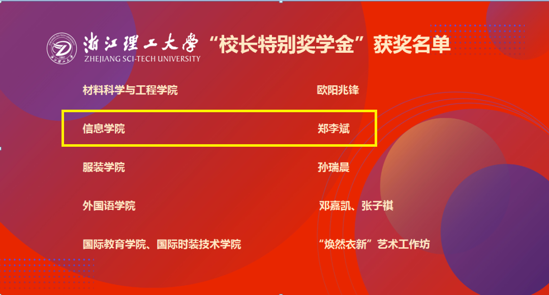 2019级软件工程专业硕士研究生郑李斌获得了“校长特别奖”。他两年综合测评排名专业第一和第二,曾获国家奖学金、校三好研究生和优秀研究生干部等奖项、荣誉。科研学习方面发表SCI二区期刊《SCIENCE CHINA Information Sciences》论文一篇,EI收录国际会议DSA论文一篇。同时在文体竞赛等方面上取得了优异成绩,他以国赛6金2银2铜的成绩填补了学校在跆拳道项目国赛奖项上的空白,省赛2金再续浙理辉煌。