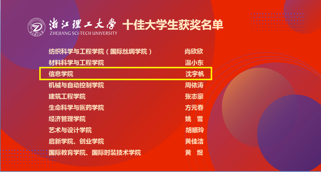 2018级计算机科学与技术(全英文)专业本科生沈宇帆获得了“十佳大学生”称号。他学年绩点综合测评均为专业第一,推免至浙江大学继续深造。在校期间曾荣获各类竞赛荣誉20余项,其中省级及以上一类学科竞赛获奖6项;曾获批国家级大学生创新创业训练计划立项,软件著作权5项,二级期刊论文两篇(第一作者);还前往区块链技术独角兽企业实习,参与多个区块链科技项目,其中基于区块链的巡检系统在乌镇互联网大会展出。大一开始合伙创办转圈校园二手交易平台,截止目前已有3000多校内用户,同时是一家大学生科技创业类公司主要合伙人。