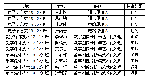 第15周我院学生工作办公室和学风建设指导中心会学习部对学生课堂出勤情况和学习表现进行了随机抽查,现将抽查结果通报如下。