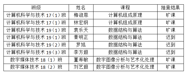 第12周我院学生工作办公室和学风建设指导中心会学习部对学生课堂出勤情况和学习表现进行了随机抽查,现将抽查结果通报如下。