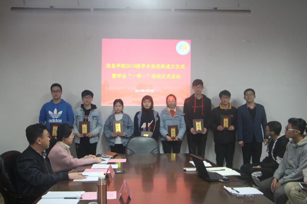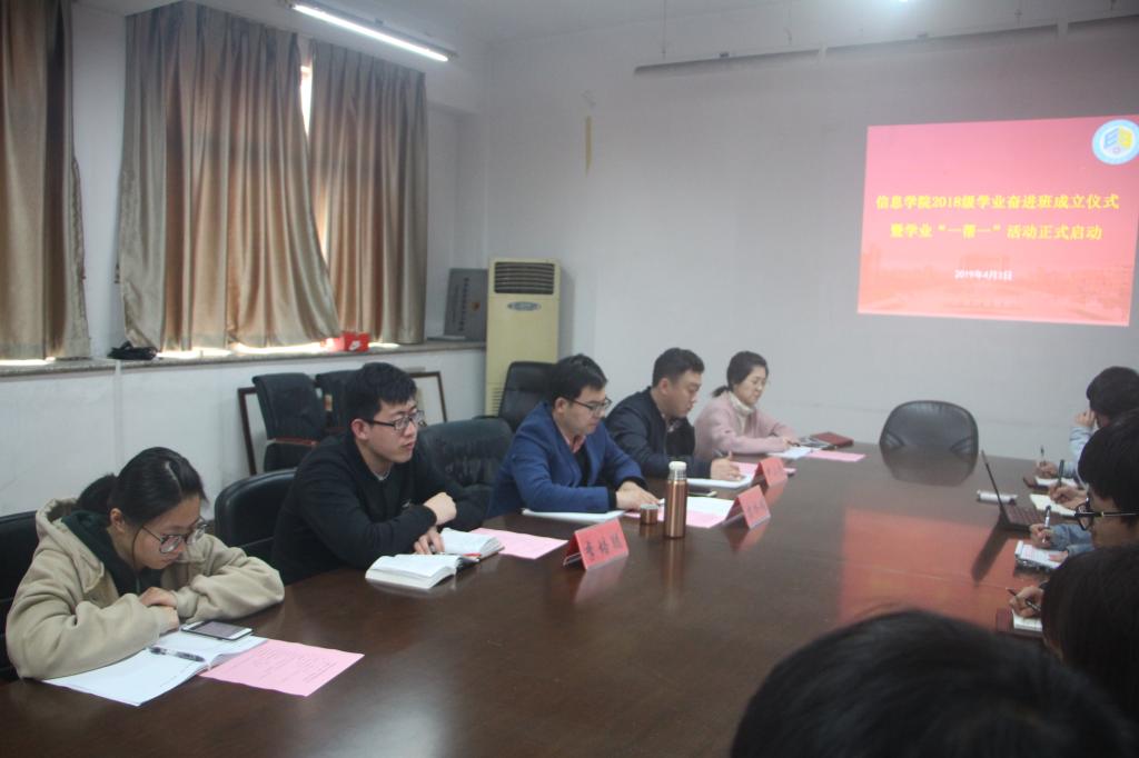为进一步精准帮扶学业困难学生,4月3日下午,信息学院2018级学业奋进班成立仪式在10号楼420举行,学业“一帮一”活动也正式启动,学院党委副书记方水明、教学秘书李培聪、2018级辅导员顾林彬、互助小组成员以及2018级奋进班学员参加此次活动,成立仪式由院学生工作办公室主任尹小虎主持。