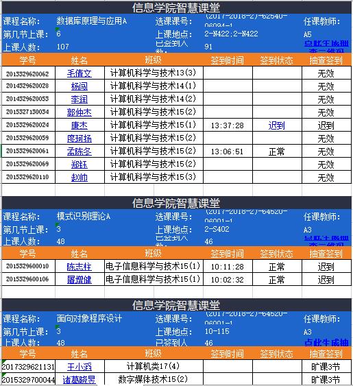 为进一步推动学风建设,加强学生管理,营造良好学习氛围,提升学风建设内涵,学生工作办公室和任课老师利用信息学院数据决策系统对学生课堂出勤情况和学习表现进行了随机抽查,现将抽查结果通报如下: