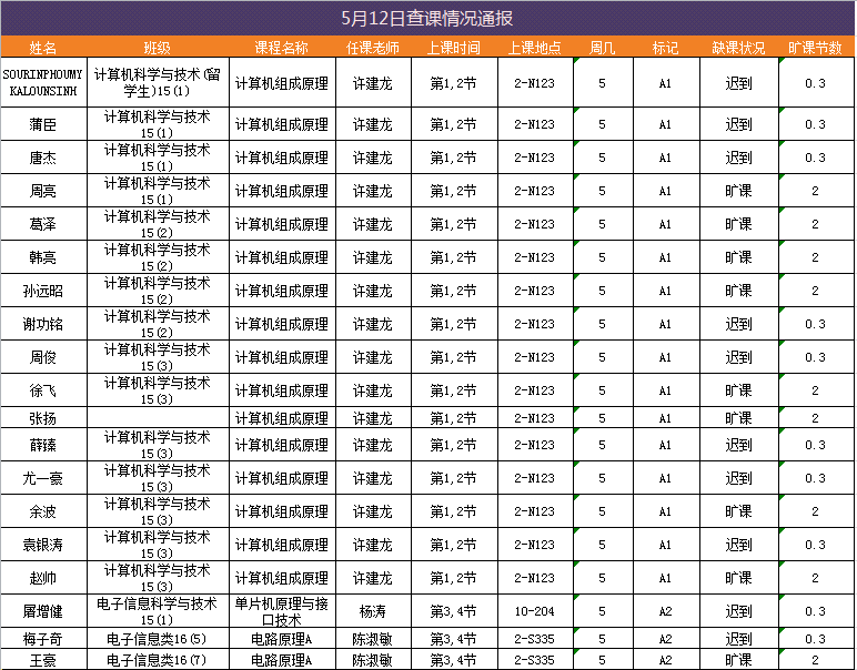 为进一步推动学风建设,加强学生管理,营造良好学习氛围,5月12日我院学生工作办公室对学生课堂出勤情况和学习表现进行了随机抽查和听课,现将抽查结果通报如下,请相关班级做好学生的教育引导工作。今后学院学生工作办公室和学生组织将长期开展不定期集体听课抽查活动,及时将听课抽查结果公示在学院网站,请各学生班级和同学关注。