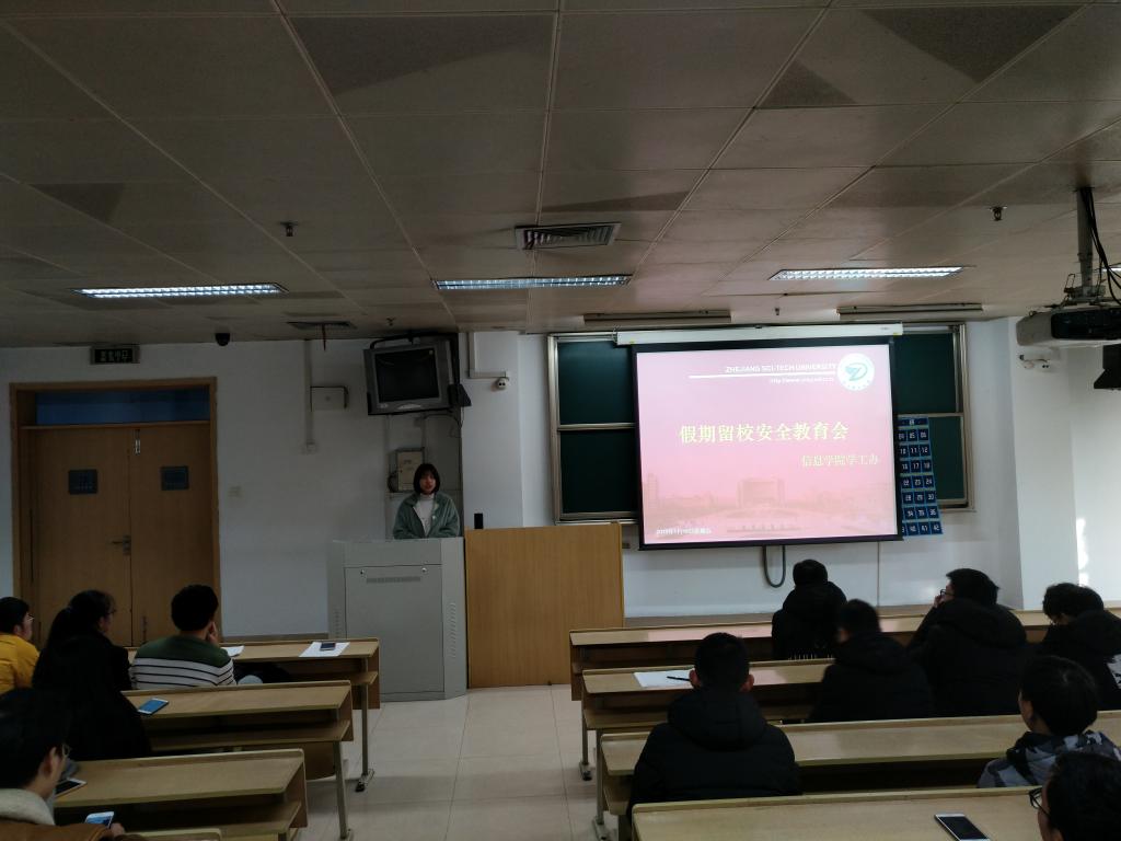 为加强2019年寒假留校学生的安全教育与管理,信息学院学工办于1月18日下午在2N-129召开了2019年寒假留校学生安全教育大会。学院党委副书记方水明、社区指导老师黄诗莹,全体假期留校学生参加了会议。