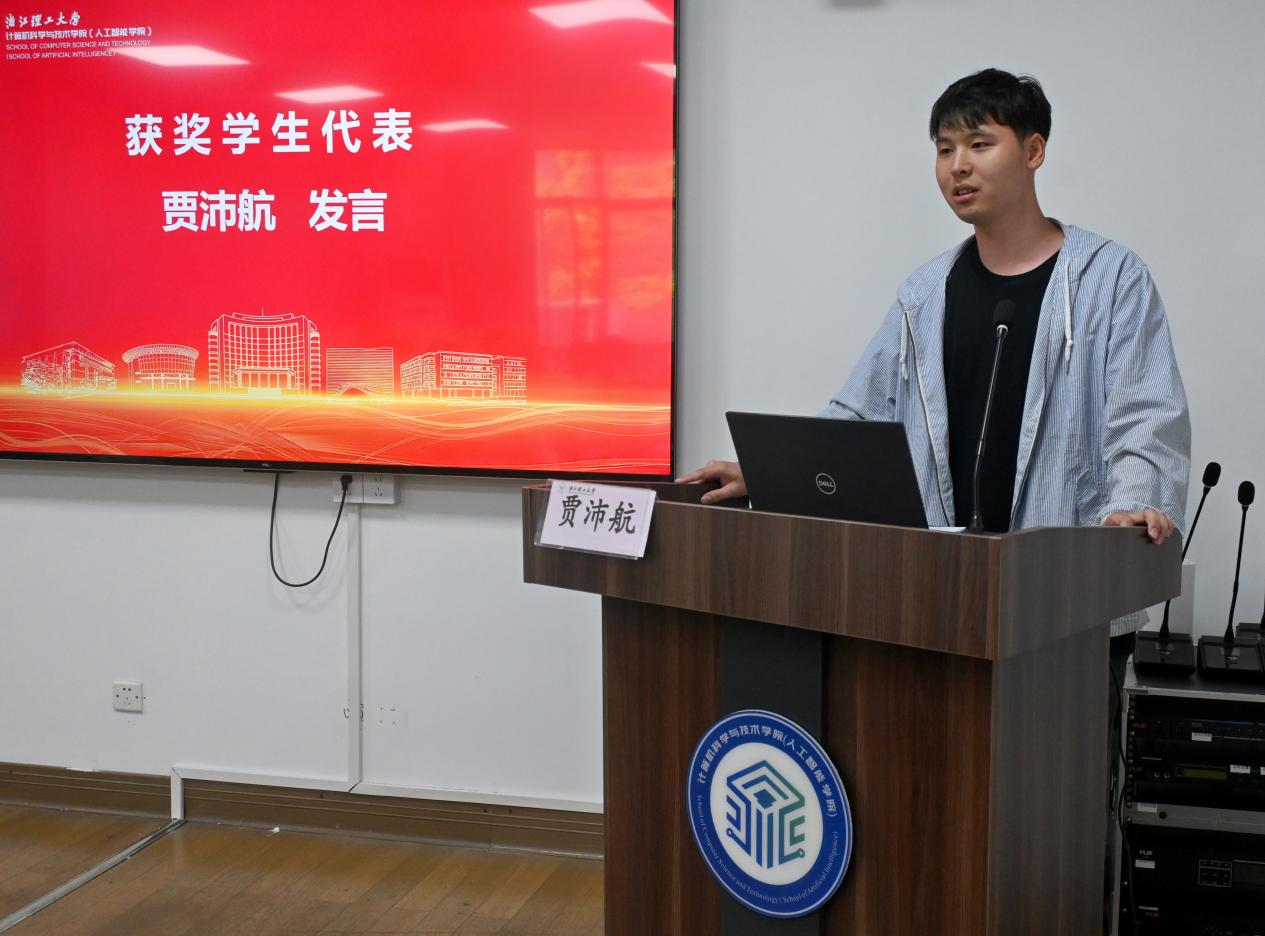 获奖学生代表贾沛航就自己的科研经历、学生工作、志愿服务进行了汇报,并向峰客公司的资助、学院的帮扶表示感谢。他表示自己会在日后的学习生活中继续不畏困难、拼搏奋斗。