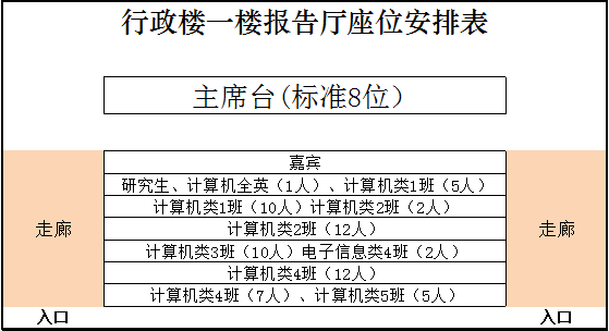 2、请各班于13:40分根据座位安排入座完毕,各班级根据考勤名单做好签到工作。讲座结束以后统一交给各年级辅导员。