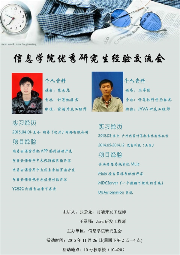 针对目前互联网行业的兴起,越来越多信息学院的研究生投奔于这个蓬勃发展的行业里来。而不少目前在读的研究生在面对未来的就业方向、职业规划、研究目标、学习计划比较模糊。我们将结合这些问题,从软件、硬件、大数据三个就业方向,分批次邀请我院优秀的研究生毕业生返校开展经验交流会。