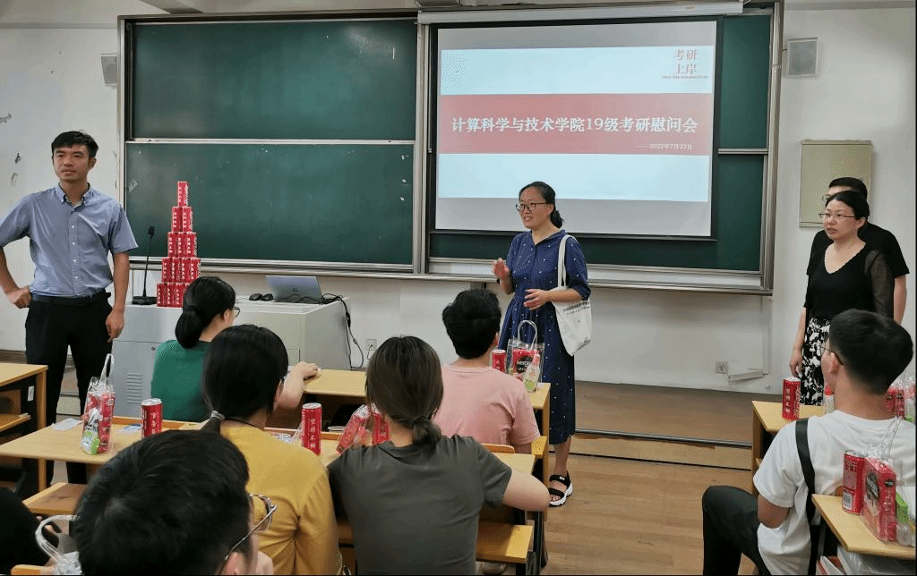 黄黎一行首先来到考研教室,看望了在考研教室认真复习的学生们,对同学们在酷暑里依然坚持辛苦复习表示了诚挚地关心和充分的肯定。学院为同学们准备了印有“成功上岸”“梦想成真”“坚持不懈”等祝福语的可乐和防暑降温礼包,表达对同学们鼓励和期盼。