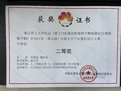 2021年8月26-30日,中国大学生计算机设计大赛人工智能挑战赛国赛决赛由三江学院(南京)承办、百度在线网络技术有限公司协办,通过线上举行答辩和测试,由我院陈巧红老师带领的1支队伍获奖,计算机系学生(常晨浩、潘跃前)获得国赛二等奖。