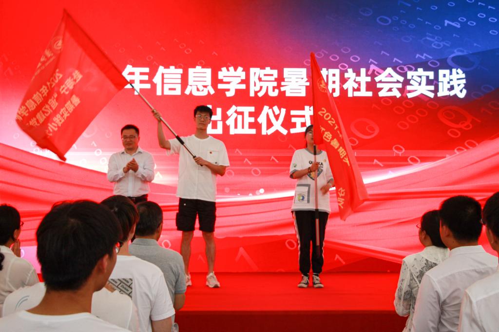 闭幕式上还举行了2021年信息学院暑期社会实践出征仪式,蒋明峰为两支实践队代表“赴嘉兴红色暑期实践小分队”和“赴海宁‘追忆建党百年’暑期实践小分队”授旗。