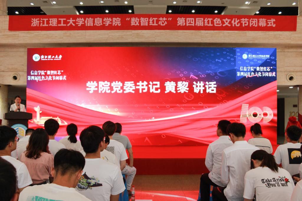 在建党百年华诞即将来临之际,6月30日下午,我院在国际会展中心一楼展厅举行“数智红芯”第四届红色文化节闭幕式。学院党委书记黄黎,院长丁佐华,杭州峰景科技有限公司副总经理余艳,浙江天眼创智科技有限公司行政经理胡可,副院长蒋明峰、姚青,党委副书记包新春出席了闭幕式,纪委委员、各党支部书记、师生党员代表参加了本次活动。闭幕式由学工办主任朱诗威主持。