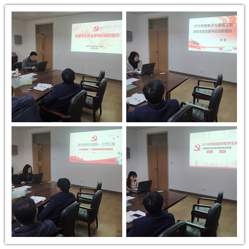 会上,来自学院电子学生、智科学生、通信学生、数媒学生、计算机学生、电通研究生、信号研究生、计科研究生、软工研究生、计技研究生等10位学生党支部书记,对照职责要求,从坚持理论学习、强化支部建设、开展主题教育等方面进行述职汇报,全面总结2019年取得的工作成效,指出了存在的不足和出现的问题,并提出下一步整改措施和努力方向。