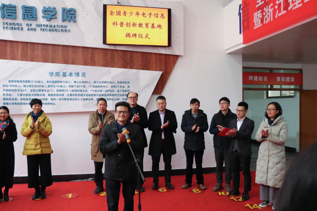副院长姚青宣读了中国电子学会的基地批复文件。俞晴和校党委学工部部长胡琦为“全国青少年电子信息科普创新教育基地”揭牌。校团委书记吕媛媛为“全国青少年电子信息科普创新教育基地志愿服务队”队长颁发聘书。