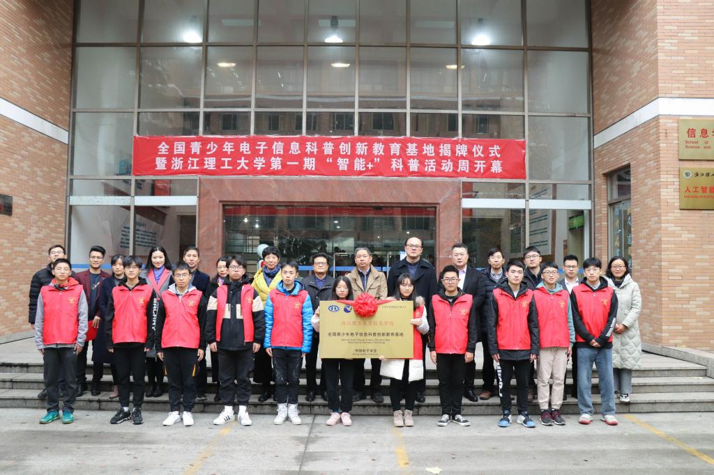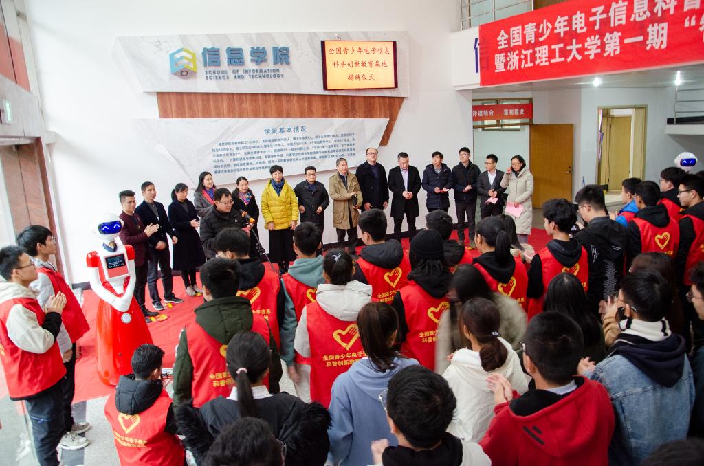 12月18日下午,全国青少年电子信息科普创新教育基地揭牌仪式在我院一楼大厅举行。校党委副书记陶伟华出席仪式,浙江省机器人协会会长俞晴,钱塘新区管委会经发科技局副调研员田焕荣,校党委学工部、校招生与就业处、校友办、校团委、信息学院相关负责人,杭州泽高机器人科技有限公司、杭州欧优机器人科技有限公司等企业的代表,以及基地志愿者、学生代表等百余人参加了此次揭牌仪式。