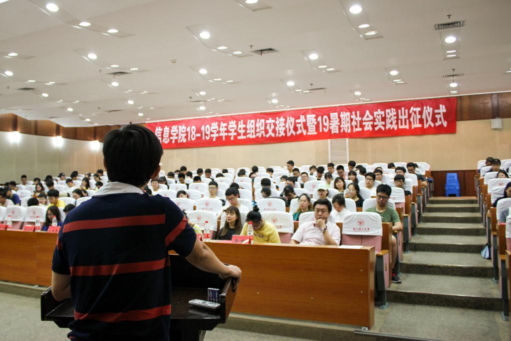 为使新学年学生组织工作开展更加顺利,锻炼学生组织新成员能力,6月28日下午,球王会体育官方网站信息学院18-19学年学生组织交接仪式暨2019年暑期社会实践出征仪式于球王会体育官方网站行政楼二楼报告厅正式举行,会议由团学会主席肖芙苏主持。
