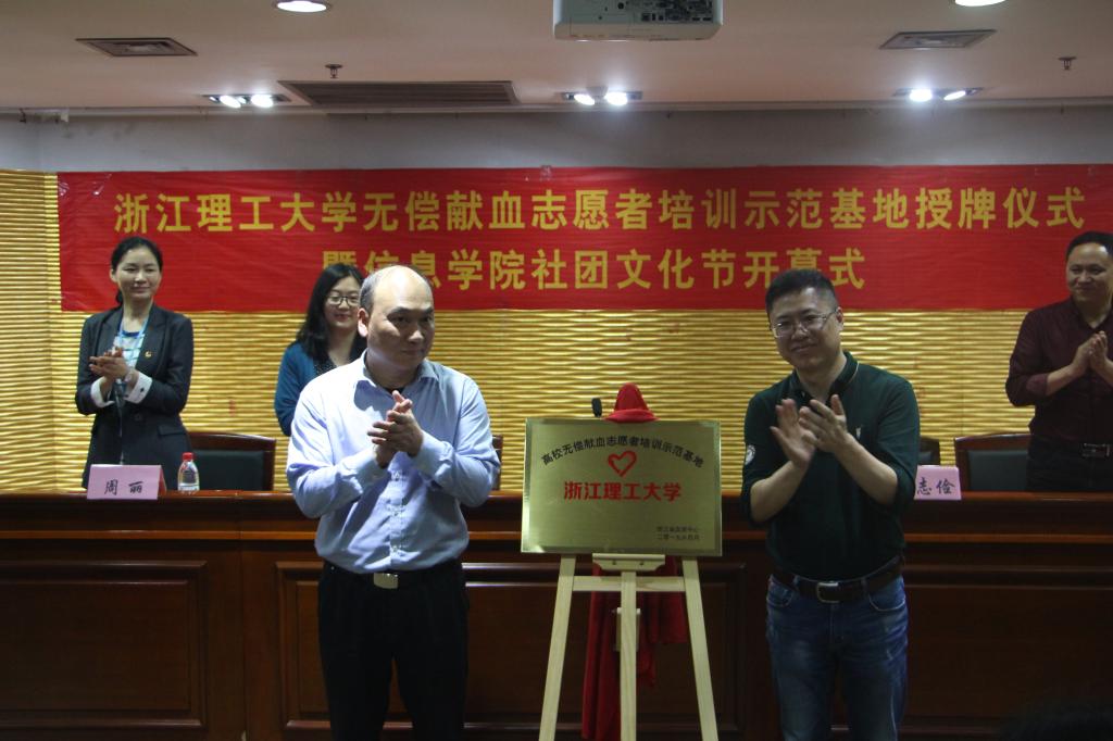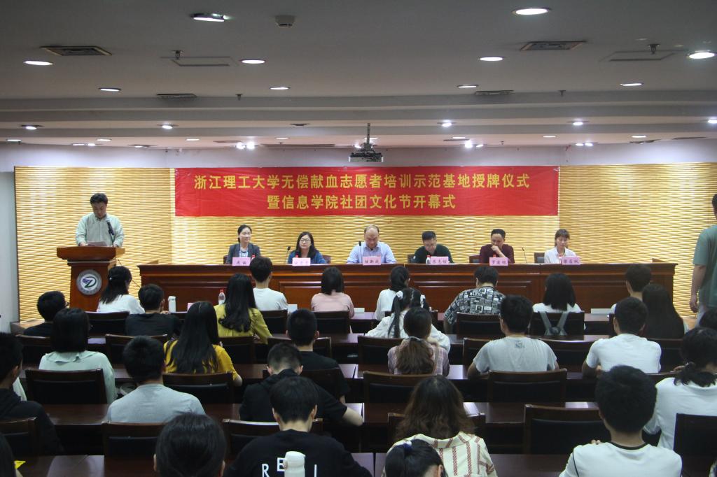 4月24日下午,球王会体育官方网站无偿献血志愿者培训示范基地授牌仪式暨信息学院社团文化节开幕式在球王会行政楼一楼报告厅举行。浙江省血液中心党委书记、副主任陆新成,浙江省血液中心社会事务科科长罗建根,浙江省血液中心团委书记周丽,我院党委书记苏志俭,校团委副书记祝莺莺,校医院院长梁若枫出席了本次会议,会议由我院团委书记尹小虎主持,会上进行了“球王会体育官方网站无偿献血志愿者培训示范基地”的授牌仪式。