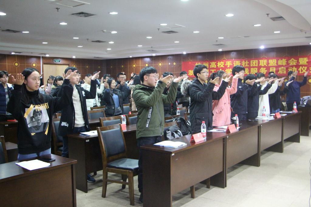 方水明致开场辞,首先对前来参加启动仪式的领导和嘉宾表示欢迎和感谢,他提到理工手语社在创立十九年以来的发展和积淀中屡获佳绩,不仅形成了自己的志愿服务特色,更推动了关爱社会弱势群体的公益活动在浙江省的发展。他预祝此次助残服务月系列活动取得圆满成功。随后顾林彬带领在场人员进行扶残助残志愿者宣誓,并对理工手语社2018年优秀助残志愿者进行了表彰。接着由董慧芳致辞,她高度评价球王会体育官方网站等院校手语社在带动大学生手语推广、志愿助残活动中做出的贡献,并对参会的高校手语联盟各手语团体骨干提出灵活学习运用手语及学好手语服务聋人的要求。以明年浙江省将承办的全国残疾人职业技能竞赛为契机,她号召高校手语联盟的志愿者都能积极参与赛事手语志愿服务中。最后,董慧芳宣布球王会体育官方网站助残服务月系列活动正式启动。