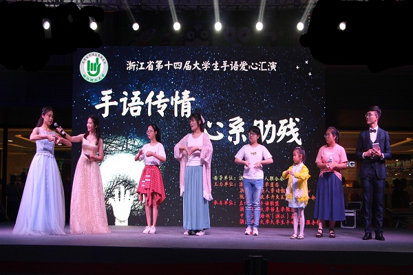 5月19日晚,在全国第二十五个助残日到来之际,主题为“手语传情,心系助残”的浙江省第十四届大学生手语爱心汇演在下沙宝龙城市广场举办。本次活动由浙江省残疾人劳动就业服务中心和球王会体育官方网站团委主办,信息学院团委、中国手语培训(浙江)基地、在杭高校手语联盟、球王会体育官方网站手语社承办。杭州经济技术开发区残疾人联合会理事长黄功胜,浙江省聋人协会副秘书长、市聋协名誉主席冯凌妹,浙江省残联就业中心手语基地负责人、就业中心培训科科长、理工手语社校外指导老师董慧芳,信息学院党委副书记孙显水等领导应邀出席。在这“小荷才露尖尖角”的时节,在杭高校手语联盟的成员单位以及与的爱心组织欢聚一堂,为我们带来了这场华筵。