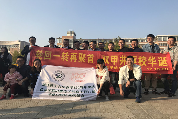 校庆当日一批批校友满载荣光返回浙理,是日早上七时在万人体育场参加了升旗仪式,庄严的国歌歌声将母校情、家国爱相融合。升旗仪式结束后,校友们来到信息学院的校友签到处前。校友之间,或对视而笑热情寒暄,或紧紧相拥诉说思念。不管是白发苍苍的老教师还是英姿勃发的年轻校友,不管是抱着孩子的三口之家,还是成群结队的同班同学,“回家”二字,成了心间久久不能淡去的甜蜜。领取纪念礼品后,校友前往十号楼各系办公室、会议室及专业教室内,进行了师生见面会,师生们共同回忆往昔,畅谈未来。