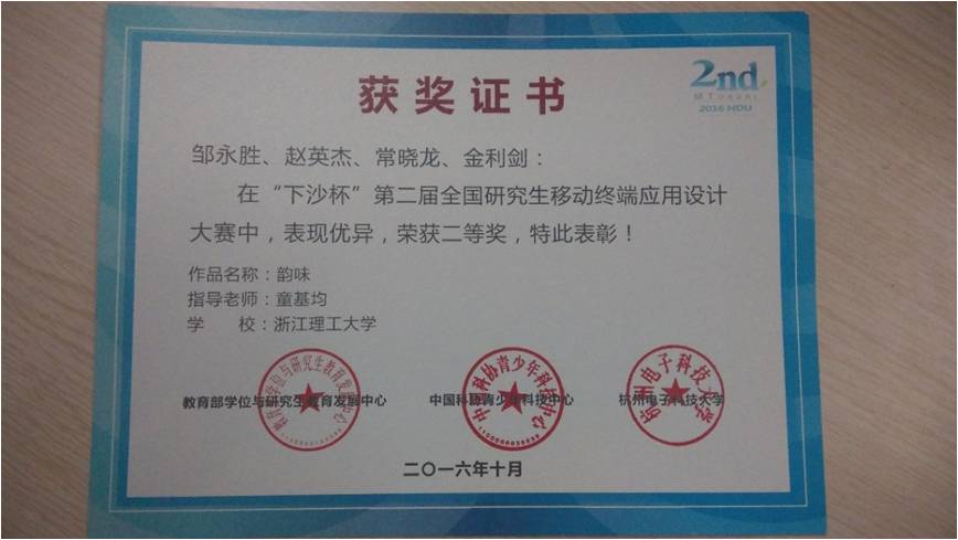 经过决赛两天作品展示及答辩环节的激烈角逐,有我院童基均老师的指导、学院邹永胜、赵英杰、常晓龙、金利剑四位同学组成的“ants”团队获得了“下沙杯”第二届全国研究生移动终端应用设计创新大赛二等奖,童基均老师也获得了此次大赛的优秀指导教师奖。