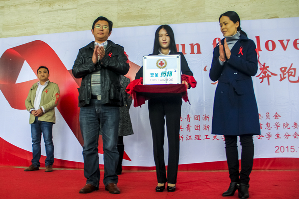 吕媛媛希望大家能够通过实际行动做好防艾理念的宣传和实践,校红十字会通过开展应急救护培训、急救员培训、设立爱心站点等多种方式为浙理学子的健康与安全贡献自己的力量。周黎和孙显水共同开启爱心药箱,为爱心站点揭幕。周黎院长也细心地为大家介绍爱心药箱的使用方法。活动中,还举行了浙江省高校禁毒防艾知识竞赛获奖同学和集体颁奖仪式。