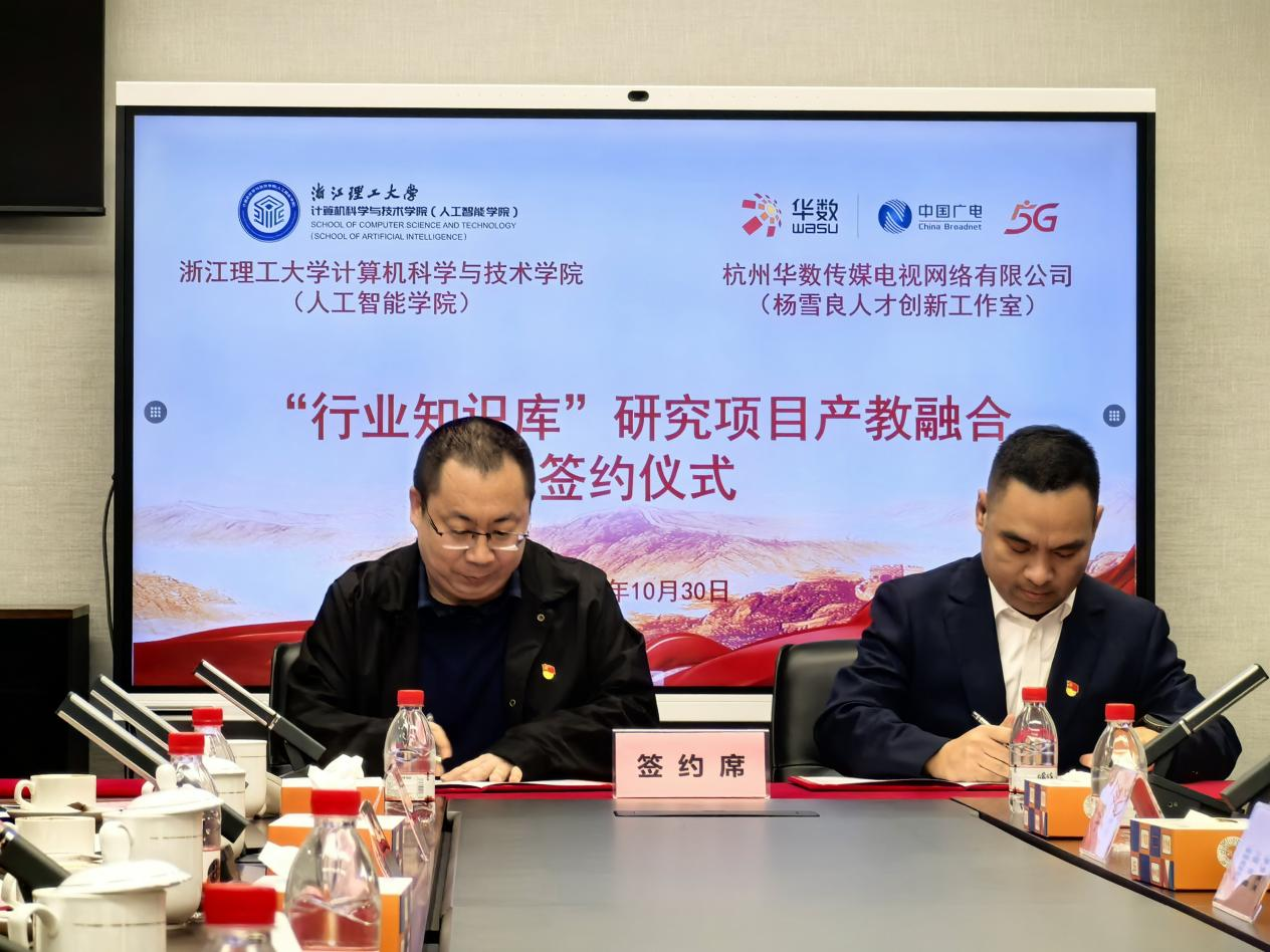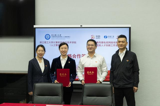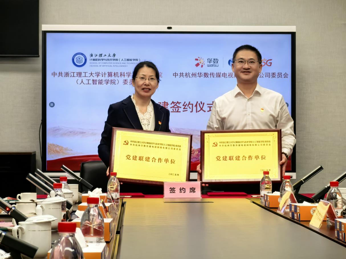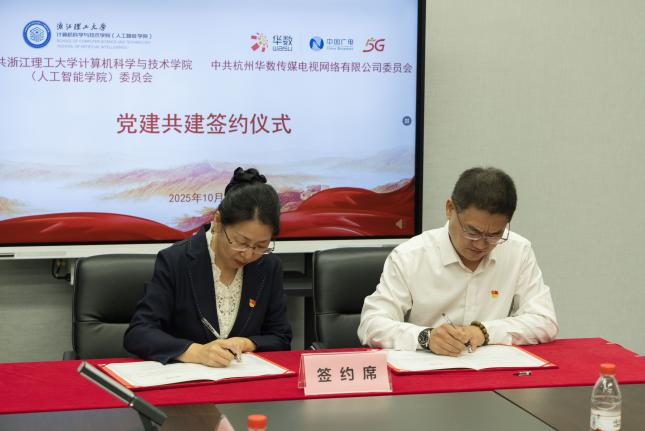 10月30日,球王会体育官方网站计算机科学与技术学院(人工智能学院)与华数传媒网络有限公司临平分公司在华数产业园举行党建共同体签约仪式暨校企战略合作。华数传媒控股股份有限公司党委副书记、总裁沈子强、临平华数党委书记、执行董事、总经理印天石,党委副书记黄兰洁、党委委员胡佳、财务总监李丹、杨雪良工作室负责人杨雪良,计算机科学与技术学院(人工智能学院)党委书记黄黎、副院长潜睿睿、党委副书记朱敏、学术副院长相东明、专职组织员沈晓斐、青年教师代表马汉杰、张宇等出席活动。